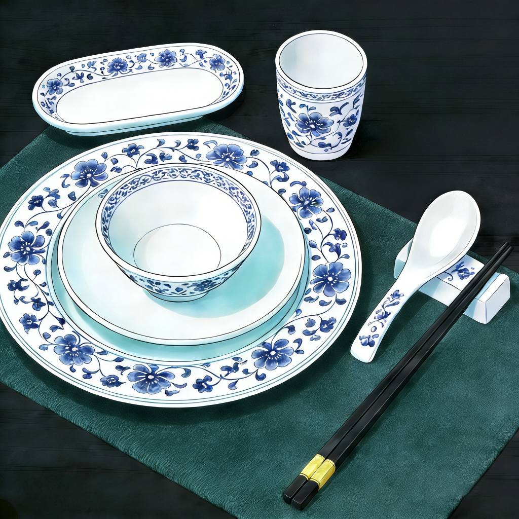 Ami az étkészletet illeti, a gyakori kínai edények közé tartoznak a csészék, tányérok, tálak, edények, pálcikák és kanalak, amelyeket általában minden étkező előtt helyeznek el. A konvenciók között figyelemreméltó tabu az "evőpálcikákkal a tálakra ütögetni". Ez az ősi koldusok gyakorlatából ered, akik koldulás közben a tálkájukat ütögették, hogy magukra vonják a figyelmet, és udvariatlanságnak tekintették az ebédlőasztalnál.