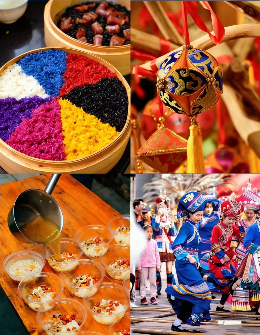 Az éneklés mellett az emberek ünnepelnek ötszínű, növényi levekkel festett nyálkás rizst, hímzett labdákat dobálnak, bambusz rúdtáncot táncolnak és bronz dobokat játszanak.